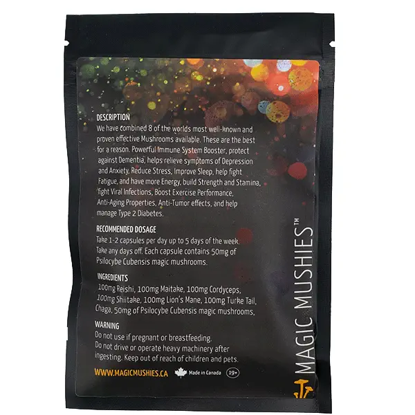 These capsules are designed to be combined with any Magic Mushies mushroom products. These trip-enhancing capsules were created to be taken with whole dried magic mushrooms, magic mushroom capsules, magic mushroom chocolate bars, gummies, or tinctures.